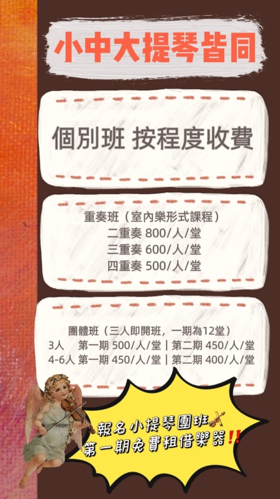 課程架構 個別課程重奏課程團體課程 根據您的需求,選擇適合您的課程,不論是團體還是個人。 個別課程 重奏課程/室內樂 團體課程 價目表 想了解更多,請透過下方QR Code進入我們的粉專,並訊息給我們,我們將會在短時間做回覆。 豐響弦樂團FB粉絲專頁